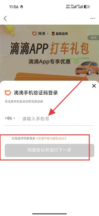 4、若領取的是滴滴相關福利,會進入滴滴手機驗證碼登錄頁面,輸入手機號,勾選已閱讀并同意相關協(xié)議,點擊同意協(xié)議并進行下一步,完成登錄領取。