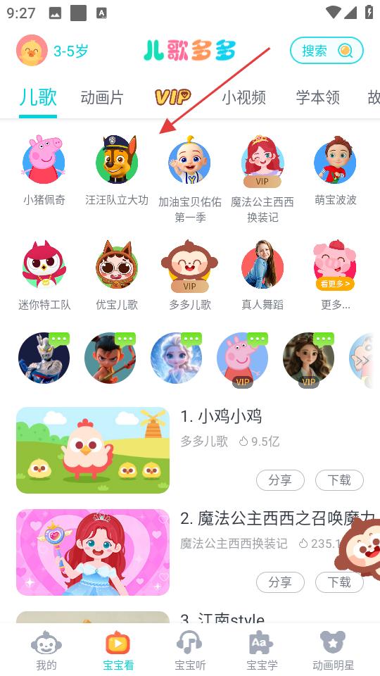 1、寶寶看頁面,有兒歌、動畫片等分類,展示小豬佩奇等IP,還有熱門兒歌如小雞小雞,可分享、下載。