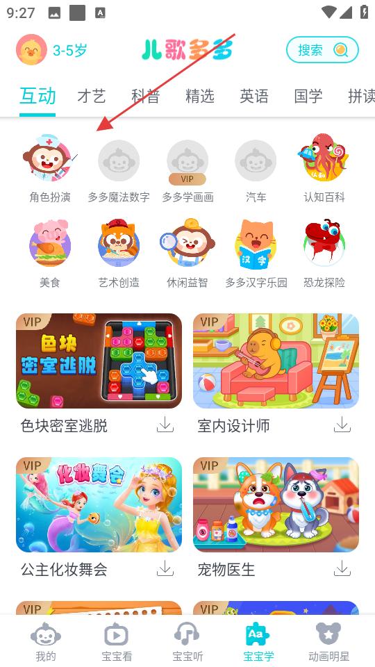 2、寶寶學(xué)頁面,含互動、才藝等板塊,有角色扮演等功能,還有色塊密室逃脫等VIP互動內(nèi)容。