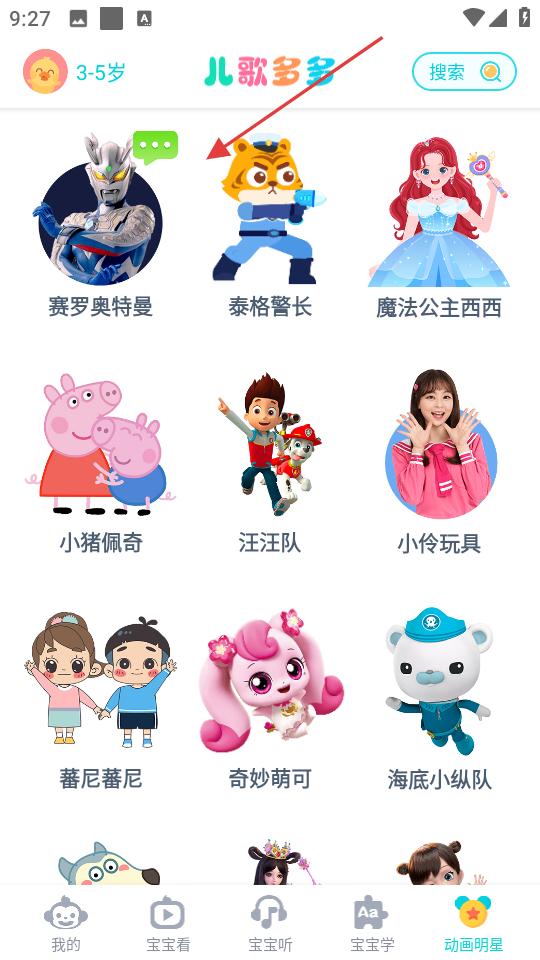 3、動畫明星頁面,羅列賽羅奧特曼、小豬佩奇等動畫IP,方便用戶快速找到喜歡的動畫角色內(nèi)容。