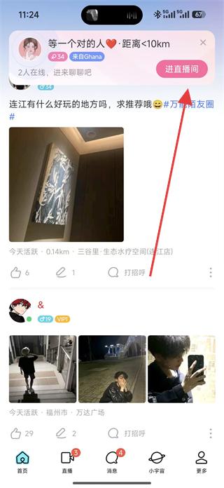 1、進入首頁可看到主播等一個對的人的直播邀請,點擊進直播間按鈕,進入主播的直播間。
