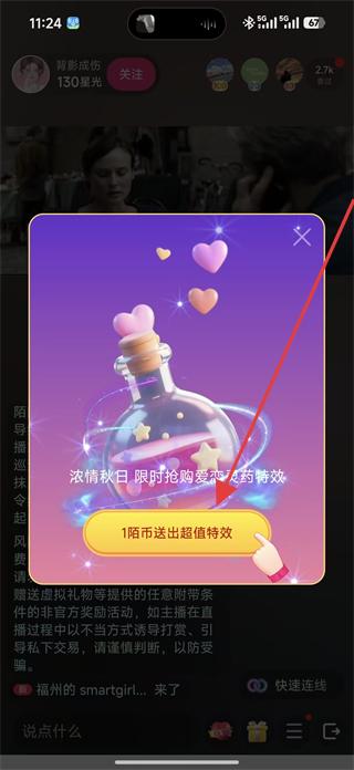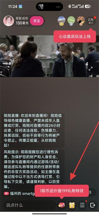 2、在直播間內(nèi)可查看主播的星光值和關(guān)注按鈕,也可看到心動嘉賓玩法上線的提示,了解直播間的互動規(guī)則。