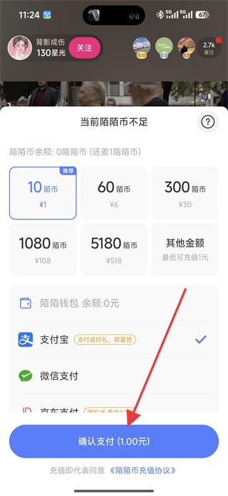 4、若陌陌幣不足可選擇充值金額如10陌幣1元,選擇支付方式如支付寶、微信支付等,點擊確認支付按鈕,完成充值后贈送禮物,參與直播間互動。