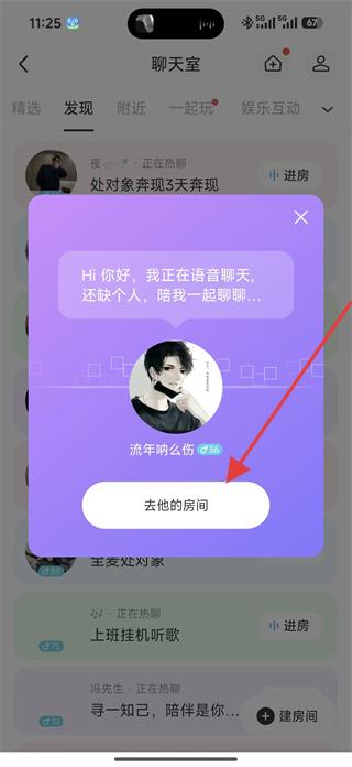 2、進入聊天室板塊可看到正在語音聊天的房間邀請,如流年吶么傷的房間,點擊去他的房間按鈕,進入語音聊天房間。