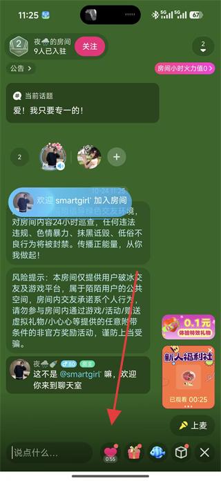 3、在聊天房間內可參與當前話題討論,發(fā)送文字消息與其他用戶交流,也可查看房間公告和風險提示,遵守聊天規(guī)則。