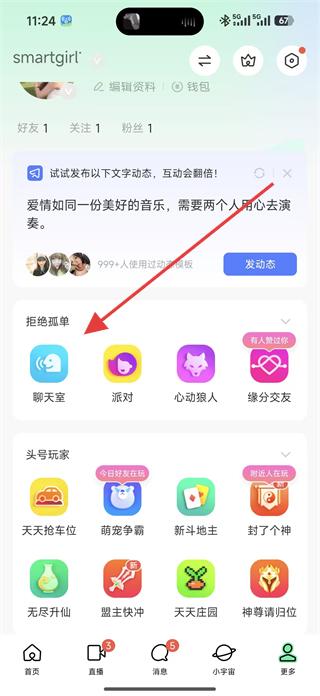 1、打開陌陌交友進入個人頁面,可查看好友、關注、粉絲數(shù)量,也可參與發(fā)布文字動態(tài)活動,還可選擇拒絕孤單板塊的聊天室、派對等功能,進入社交場景。