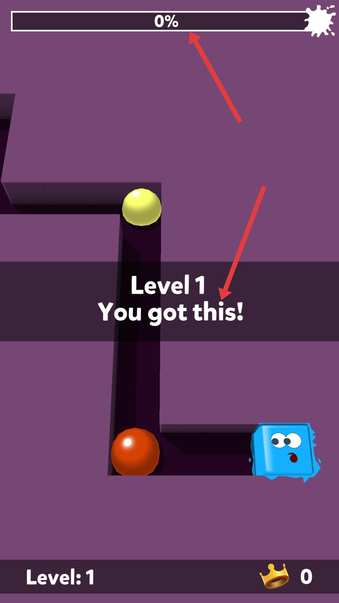 2、進入第一關(guān),界面顯示進度為0,有紅色小球和藍色方塊,跟隨箭頭所指的提示,開始在迷宮中探索移動。