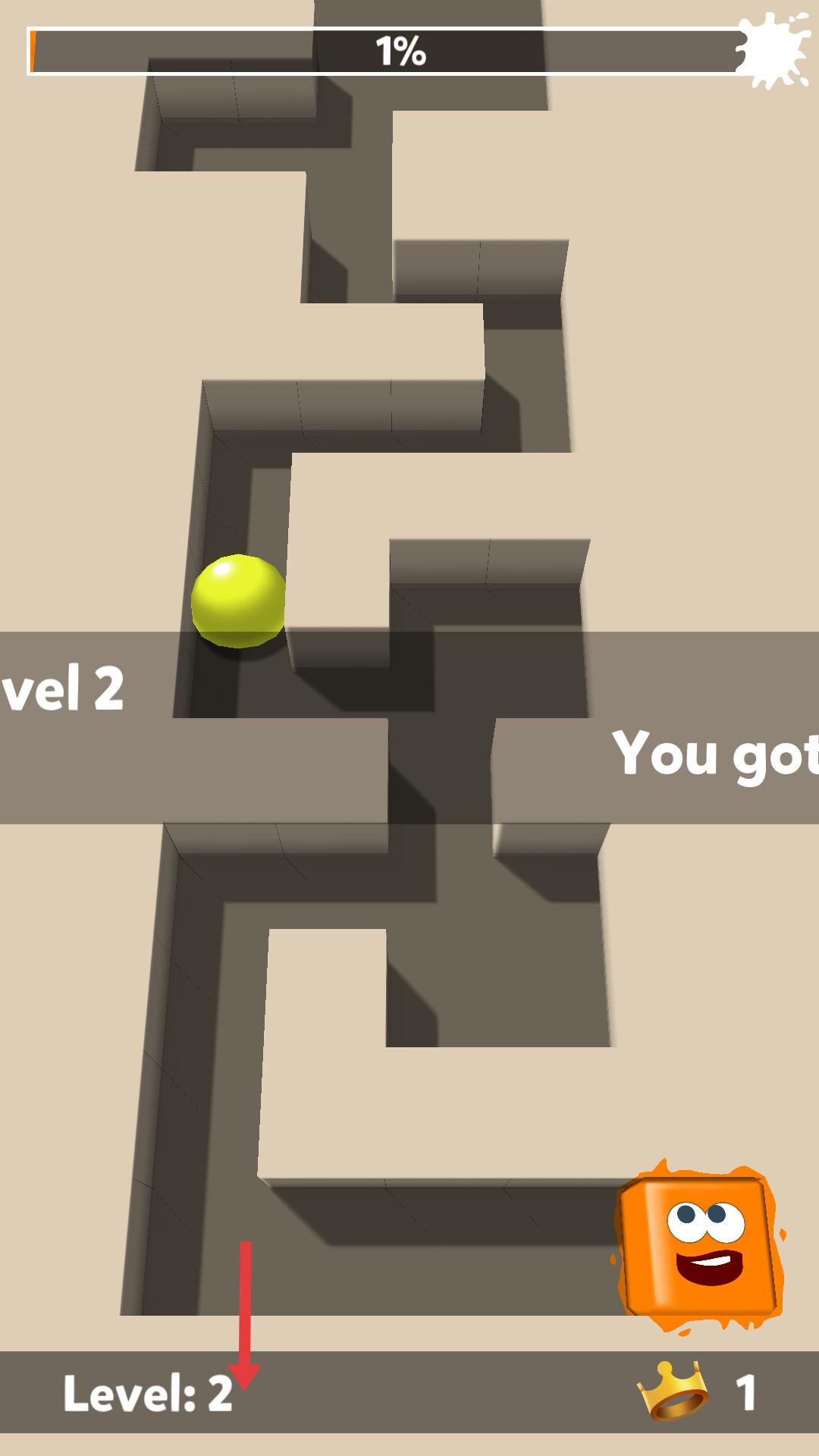 4、成功通過第一關(guān)后,進入第二關(guān),迷宮布局變化,有藍色小球和橙色方塊,界面提示第二關(guān),繼續(xù)操控方塊在新迷宮中探索移動。