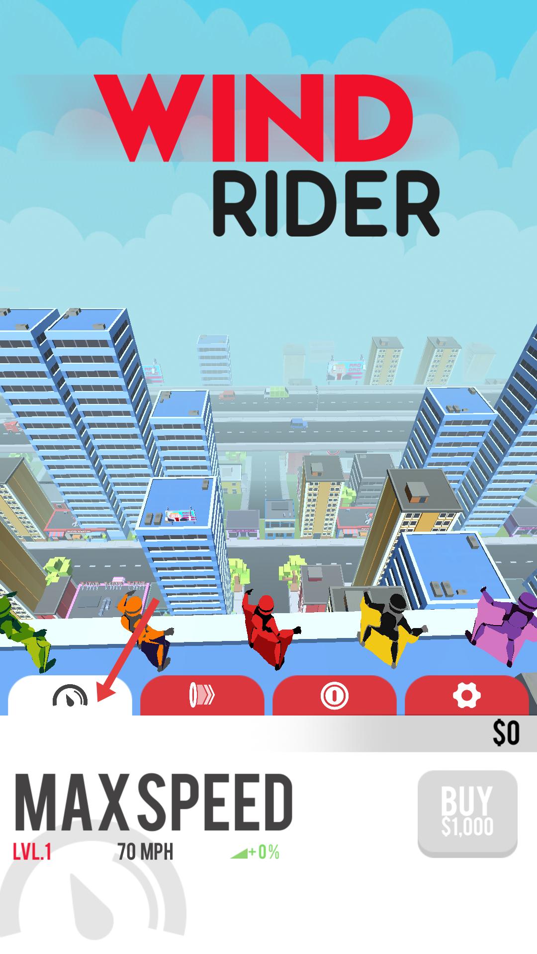 1、游戲初始界面,可查看最大速度等屬性,點擊左側(cè)相關(guān)按鈕,能為飛行做好準備,開啟在城市上空的飛行挑戰(zhàn)。