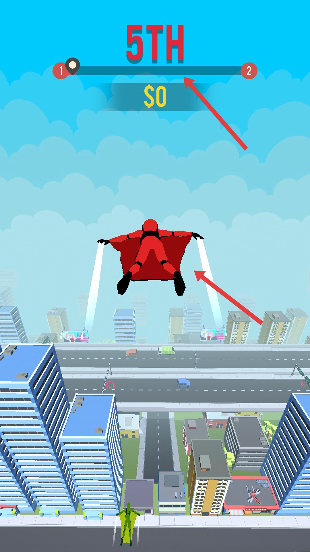 3、進入飛行環(huán)節(jié),操控紅色飛行角色,在城市上空飛行,爭取提升排名,同時注意收集金錢,助力角色成長。