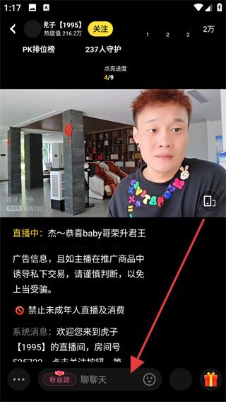 2、在娛樂直播頁面選擇感興趣的主播,比如虎子1995的直播,點擊進入其直播間,可看到直播畫面,還有PK排位榜、守護人數(shù)等信息展示。