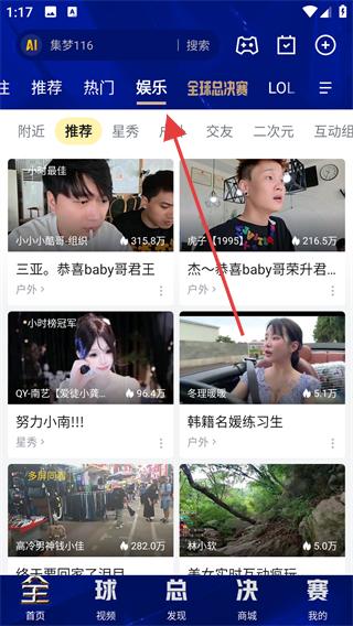 1、可看到搜索欄,還有推薦、熱門、娛樂等分類標簽,點擊娛樂標簽,進入娛樂直播頁面,能看到眾多娛樂主播的直播推薦。