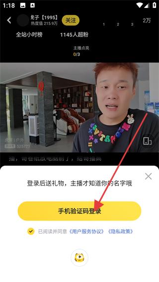 3、若要與主播互動送禮物會彈出登錄提示窗口,提示登錄后送禮物主播才知道名字,點擊手機驗證碼登錄按鈕,進行登錄操作。