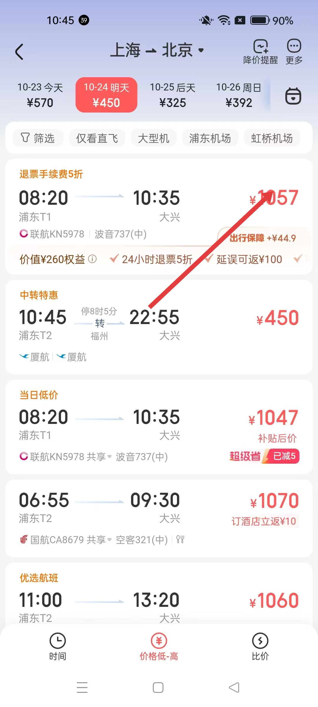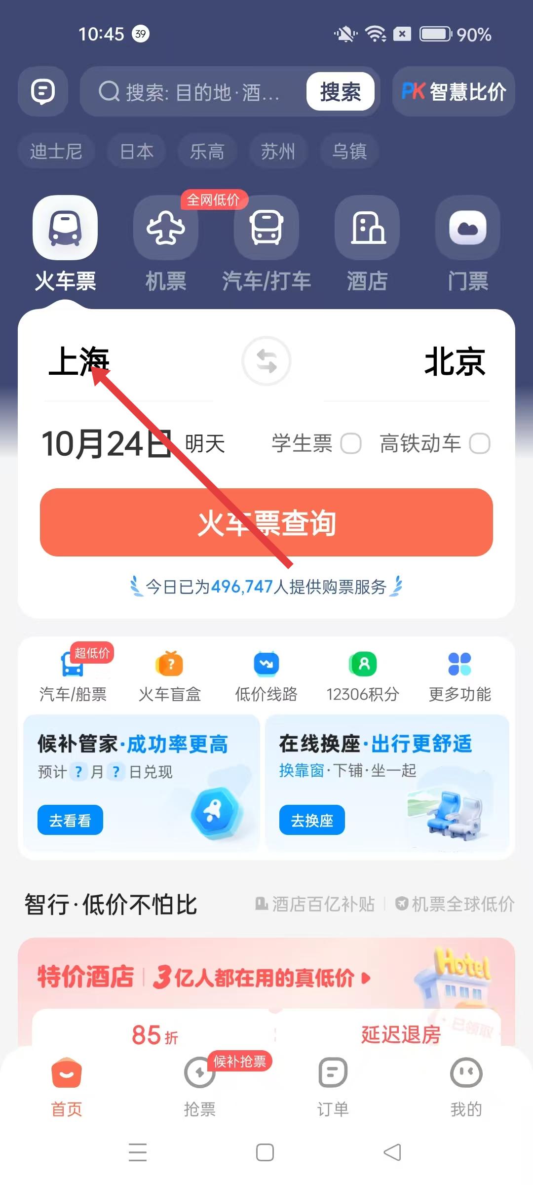 1、進入智行APP首頁后,確認出發(fā)地為上海,目的地為北京,日期為10月24日。