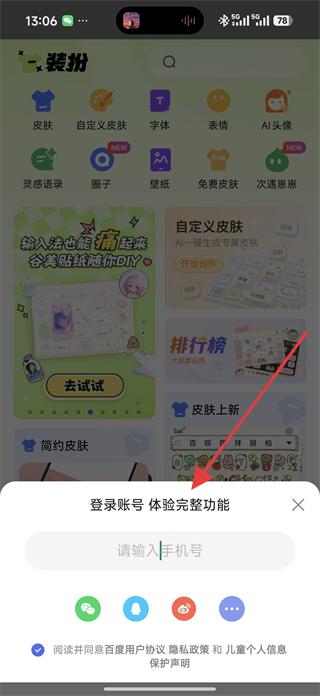 3、在登錄頁面輸入手機(jī)號或選擇微信等第三方登錄方式,完成賬號登錄,以便同步詞庫、皮膚等個人數(shù)據(jù)。