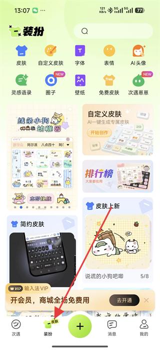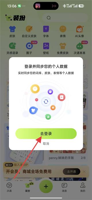4、登錄后可在裝扮頁面選擇皮膚、自定義皮膚、字體等裝扮選項,打造個性化的輸入法界面。