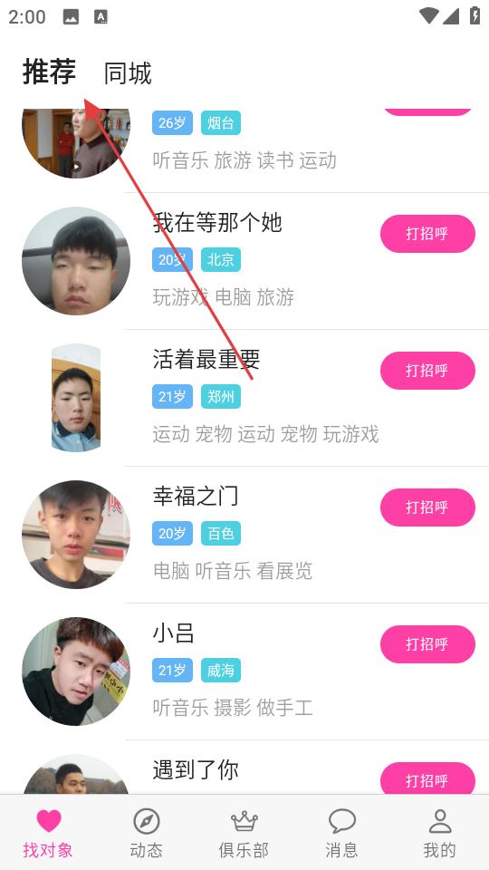 1、進(jìn)入找對(duì)象頁(yè)面,切換推薦或同城標(biāo)簽,瀏覽展示的單身用戶資料,查看年齡、城市、興趣等信息,遇到感興趣的點(diǎn)擊頭像進(jìn)入主頁(yè)。