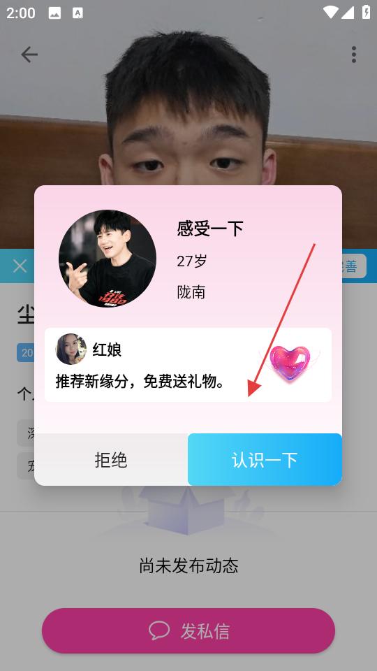 2、收到紅娘推薦新緣分彈窗,可選擇認(rèn)識(shí)一下,開啟與推薦用戶的交流,也能直接點(diǎn)擊發(fā)私信按鈕,主動(dòng)發(fā)送消息開啟互動(dòng)。