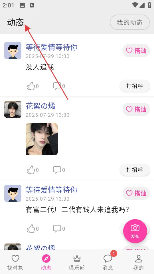 3、瀏覽其他用戶發(fā)布的動(dòng)態(tài)內(nèi)容,可對(duì)感興趣的動(dòng)態(tài)點(diǎn)贊、打招呼,或點(diǎn)擊發(fā)布按鈕,分享自己的生活狀態(tài),增加交友機(jī)會(huì)。