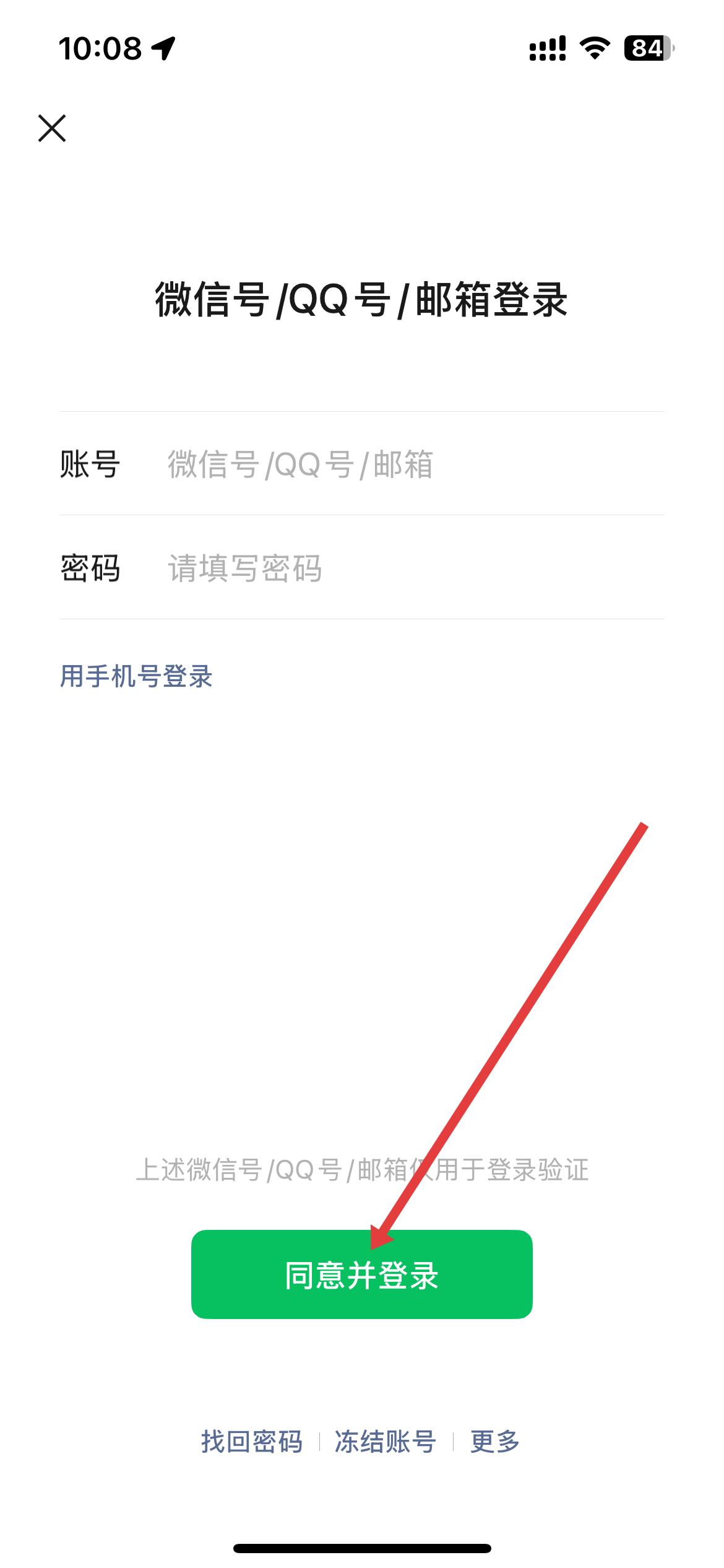 2、微信號(hào)、QQ號(hào)、郵箱登錄頁(yè)面,輸入對(duì)應(yīng)賬號(hào)和密碼,接著點(diǎn)擊同意并登錄按鈕完成登錄。