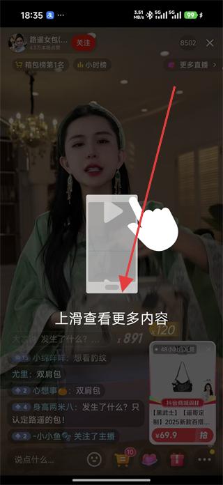 2、在直播間可上滑查看更多內容,若想關注主播,點擊主播頭像下方的關注按鈕,成為主播粉絲。