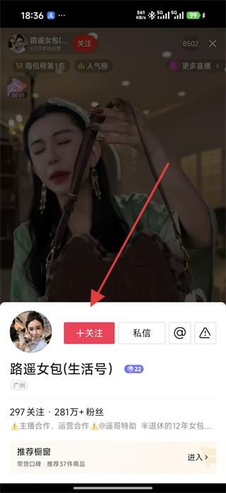 4、點開主播頭像,就可以點擊關注,主播開播就不會錯過,也可去主頁看看主播的視頻。