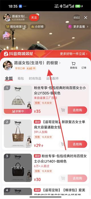 3、點擊主播櫥窗選項,進入櫥窗頁面,可查看主播推薦的商品,如包包等,選擇心儀商品點擊去搶購按鈕。