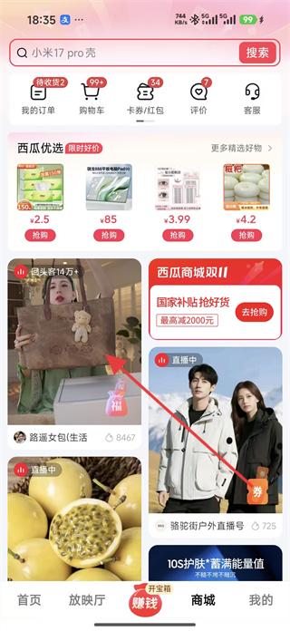 1、打開西瓜視頻軟件,在商城板塊找到心儀的直播,如路遙女包生活號的直播,點擊進入直播間。