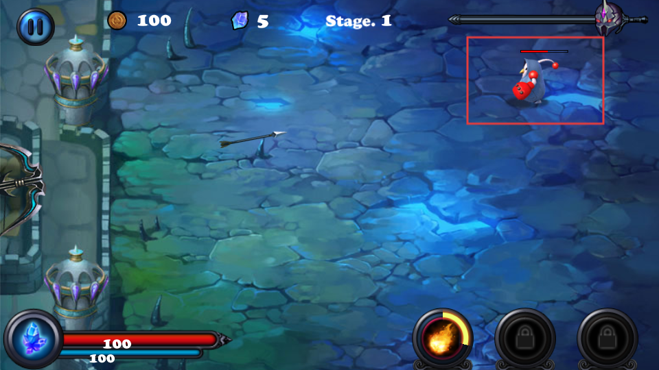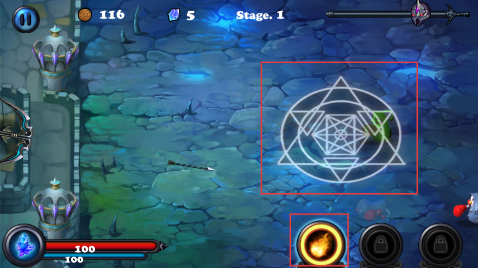 2、點擊技能按鈕,釋放帶有法陣效果的技能,對敵人造成范圍傷害或其他特殊效果,輔助箭矢攻擊,更高效地消滅敵人。