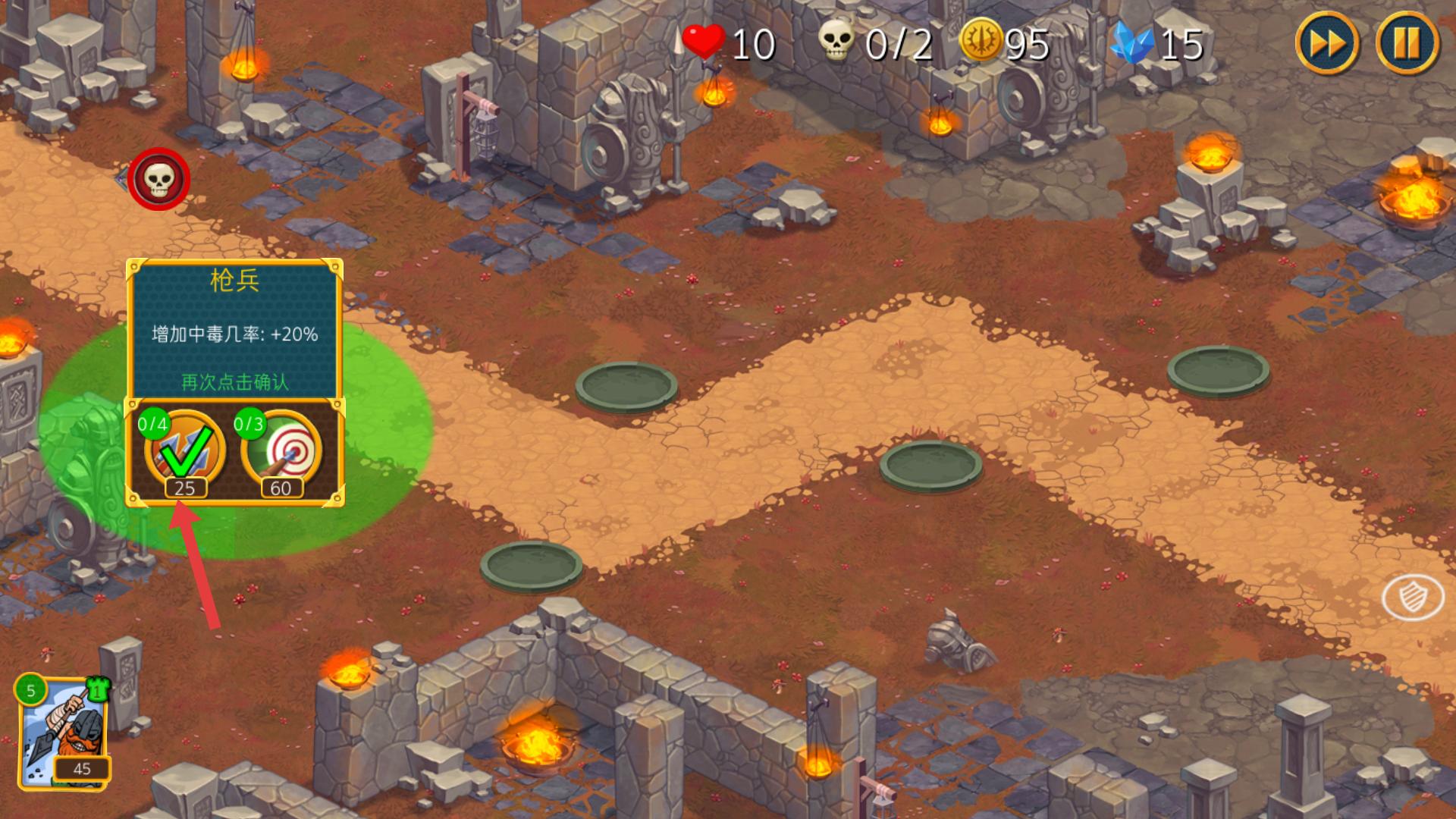 2、選擇兵種時,留意兵種的屬性加成,如槍兵有增加中毒幾率的效果,確認(rèn)選擇后再次點(diǎn)擊,即可部署該兵種參與戰(zhàn)斗。