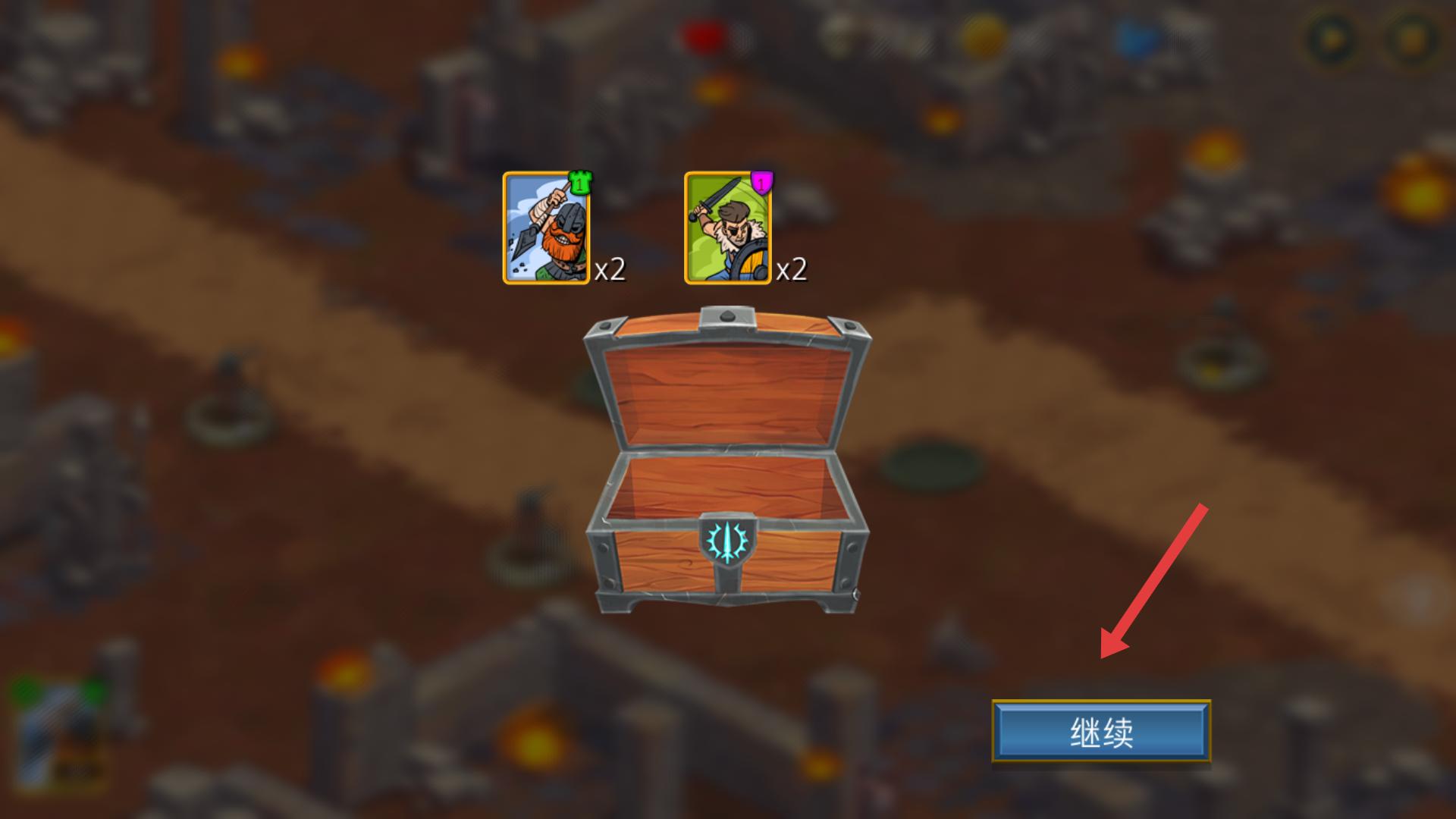 4、成功擊敗敵人后,會出現(xiàn)寶箱獎勵界面,獲取獎勵后,點(diǎn)擊【繼續(xù)】按鈕,可繼續(xù)進(jìn)行后續(xù)的游戲關(guān)卡挑戰(zhàn)。