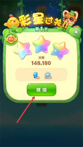 2、成功過(guò)關(guān)后,會(huì)出現(xiàn)彩星過(guò)關(guān)界面,展示分?jǐn)?shù)等信息,點(diǎn)擊繼續(xù)按鈕,就能進(jìn)入下一關(guān),開(kāi)啟新的消除挑戰(zhàn)。