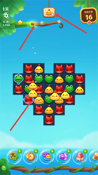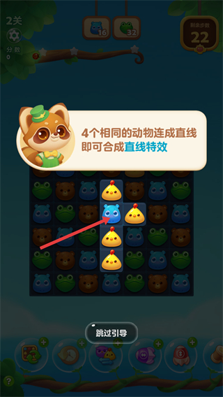 4、游戲有合成特效的規(guī)則,4個(gè)相同的動(dòng)物連成直線,即可合成直線特效,利用特效能更高效地消除動(dòng)物,完成關(guān)卡目標(biāo)。