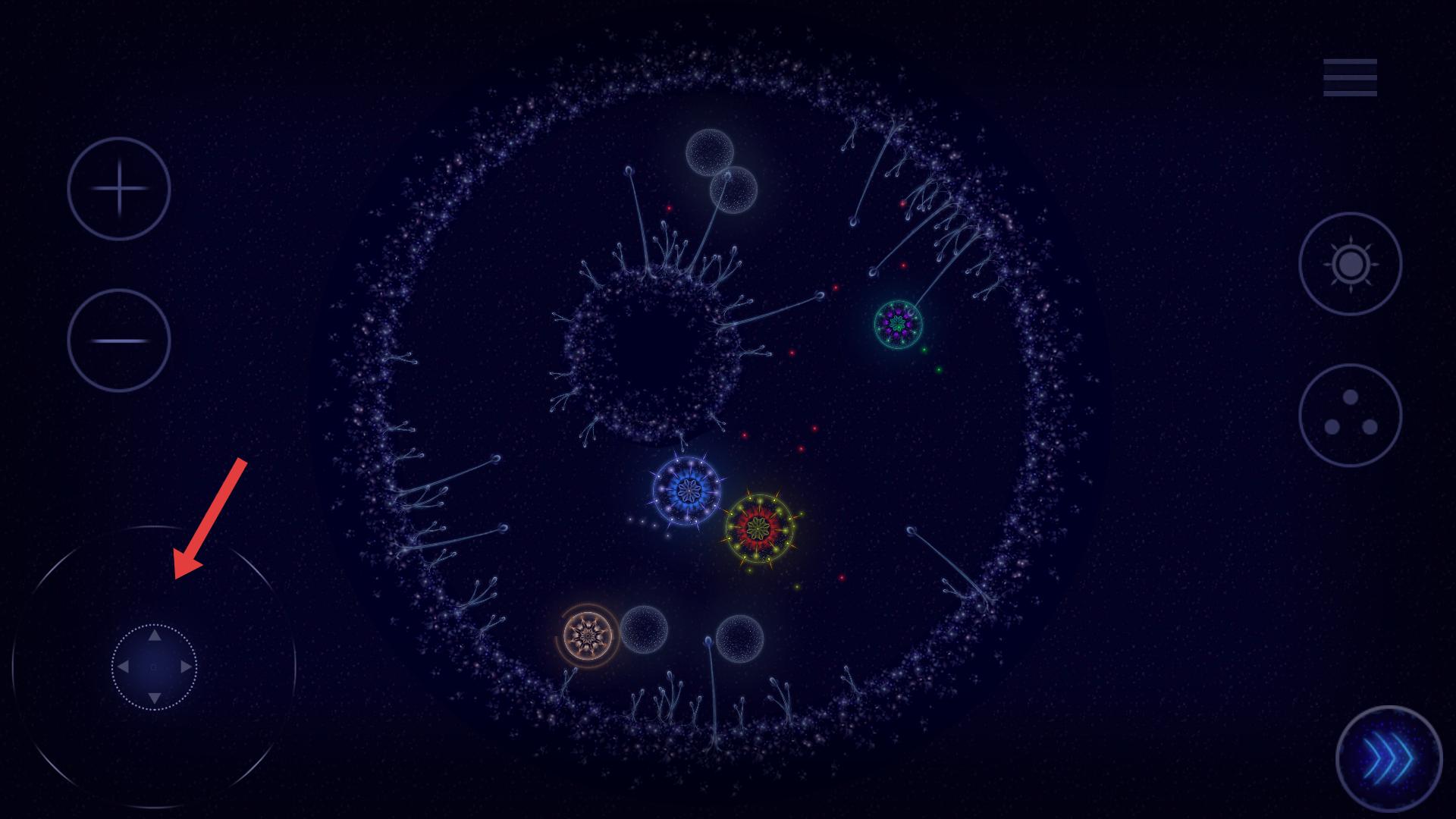 2、進(jìn)入場景后,利用左側(cè)的方向控制按鈕,在充滿各種元素的空間中探索,尋找生存與發(fā)展的機(jī)會。