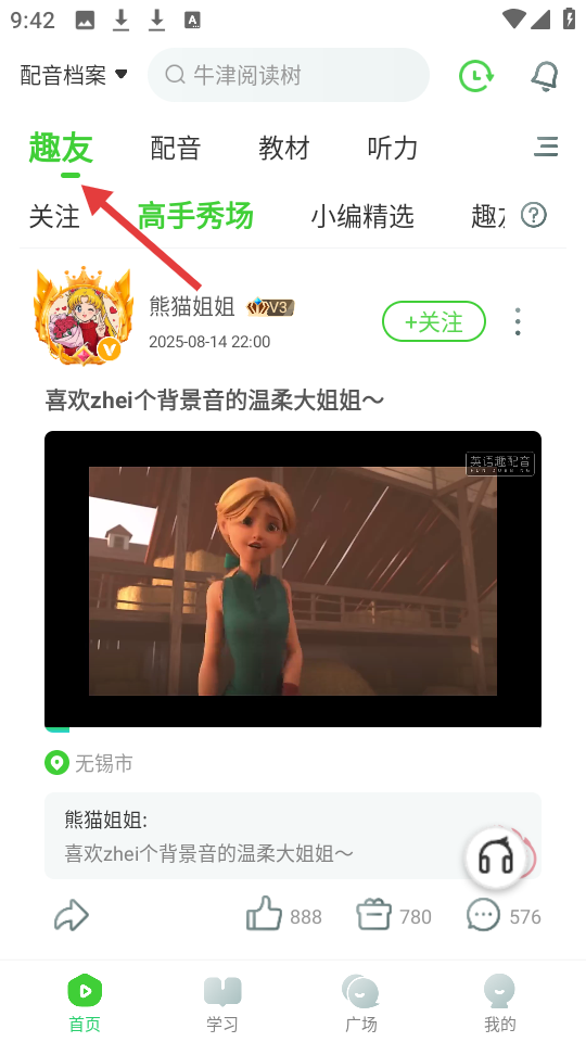 2、趣友頁面呈現(xiàn)高手秀場等欄目,展示熊貓姐姐的配音作品,可查看地點、點贊互動等。