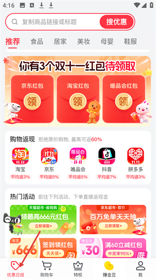 1、優(yōu)惠日?qǐng)?bào)板塊可領(lǐng)京東、淘寶等雙11紅包,購(gòu)物返現(xiàn)覆蓋多平臺(tái),最高返60,還有熱門(mén)活動(dòng)領(lǐng)最高666元紅包助力省錢(qián)購(gòu)物。