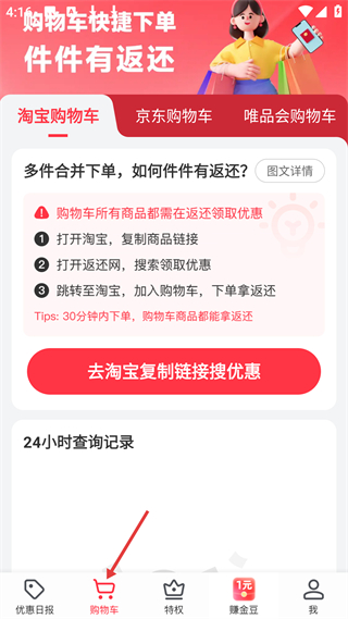 2、購(gòu)物車(chē)板塊支持淘寶、京東等購(gòu)物車(chē)快捷下單,件件有返還,需按步驟領(lǐng)取優(yōu)惠,還可查24小時(shí)查詢(xún)記錄方便跟蹤訂單。