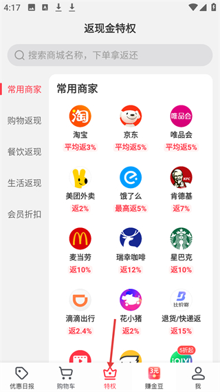 3、特權(quán)板塊有返現(xiàn)金特權(quán),涵蓋淘寶、京東等常用商家,購(gòu)物、餐飲、生活返現(xiàn)及會(huì)員折扣多樣,如肯德基返7、瑞幸咖啡返12。