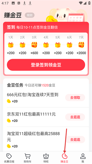4、賺金豆板塊可簽到領(lǐng)金豆,每日10、11點(diǎn)簽到翻倍,還有金豆任務(wù)賺金豆,如領(lǐng)淘寶、京東雙11紅包,積累金豆享更多優(yōu)惠。