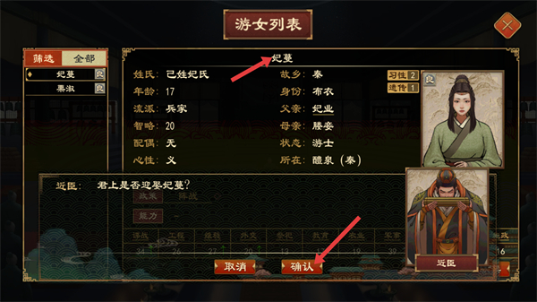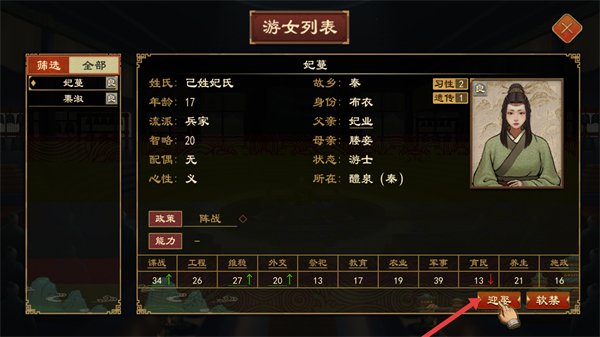 2、在游女列表中可查看游女詳情,如紀(jì)墓的屬性等,點(diǎn)擊迎娶,可開啟迎娶流程,擴(kuò)充后宮。