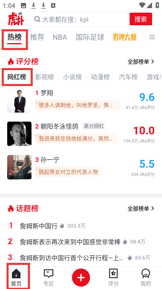 1、首頁(yè)熱榜含評(píng)分榜與話題榜,評(píng)分榜有網(wǎng)紅榜,展示羅翔等網(wǎng)紅評(píng)分,話題榜聚焦詹姆斯中國(guó)行等熱門話題信息豐富。
