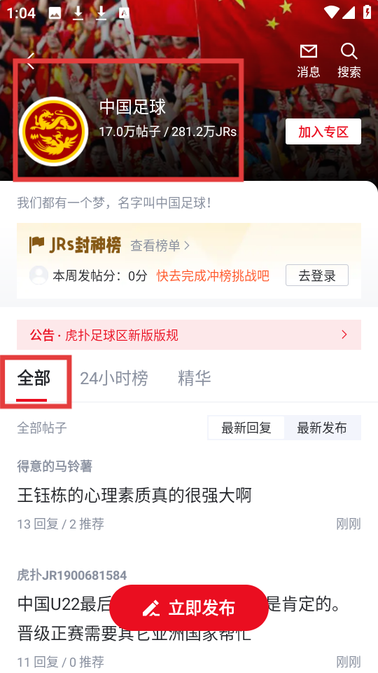 2、中國(guó)足球?qū)^(qū)顯示帖子和用戶數(shù)量,有封神榜提示分全部24小時(shí)榜等,用戶可瀏覽和發(fā)布關(guān)于中國(guó)足球的帖子。