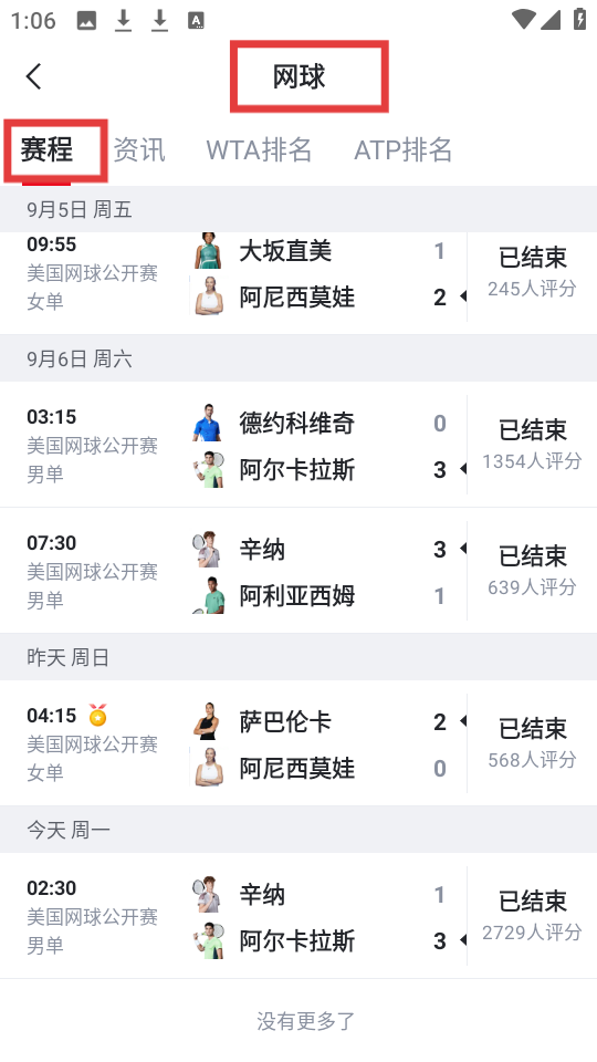 3、網(wǎng)球賽程頁(yè)面含資訊、排名板塊,展示美國(guó)網(wǎng)球公開賽賽程結(jié)果,標(biāo)注比賽時(shí)間、對(duì)陣及評(píng)分人數(shù)方便關(guān)注賽事。