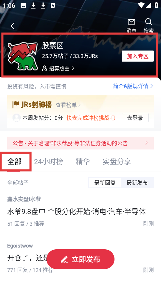 4、股票區(qū)頁(yè)面呈現(xiàn)帖子及用戶數(shù)招募版主,有治理非法薦股公告分多個(gè)榜單,用戶可查看和分享股票相關(guān)內(nèi)容。