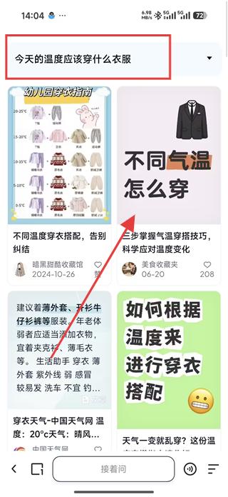 4、若想繼續(xù)詢問其他穿搭問題,可點(diǎn)擊接著問按鈕,獲取更多關(guān)于不同溫度穿衣搭配的建議。