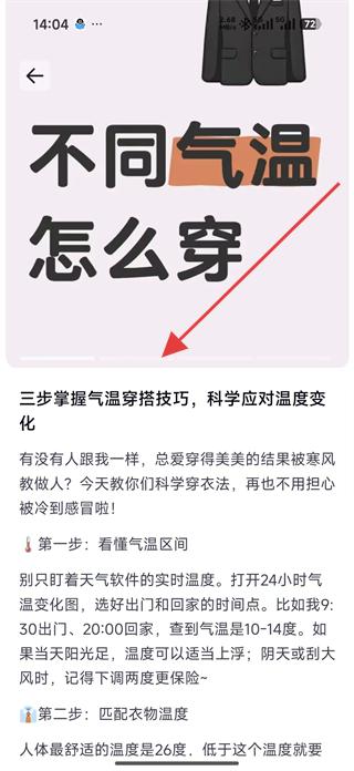 3、查看推薦內(nèi)容可學(xué)習(xí)三步掌握氣溫穿搭技巧,如看懂氣溫區(qū)間、匹配衣物溫度等,科學(xué)應(yīng)對(duì)溫度變化。