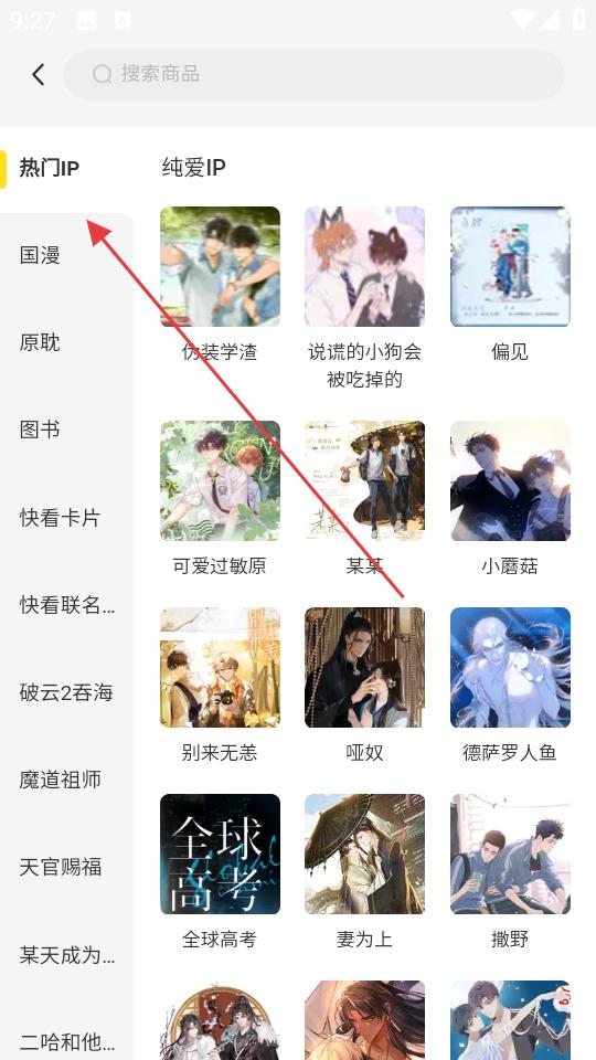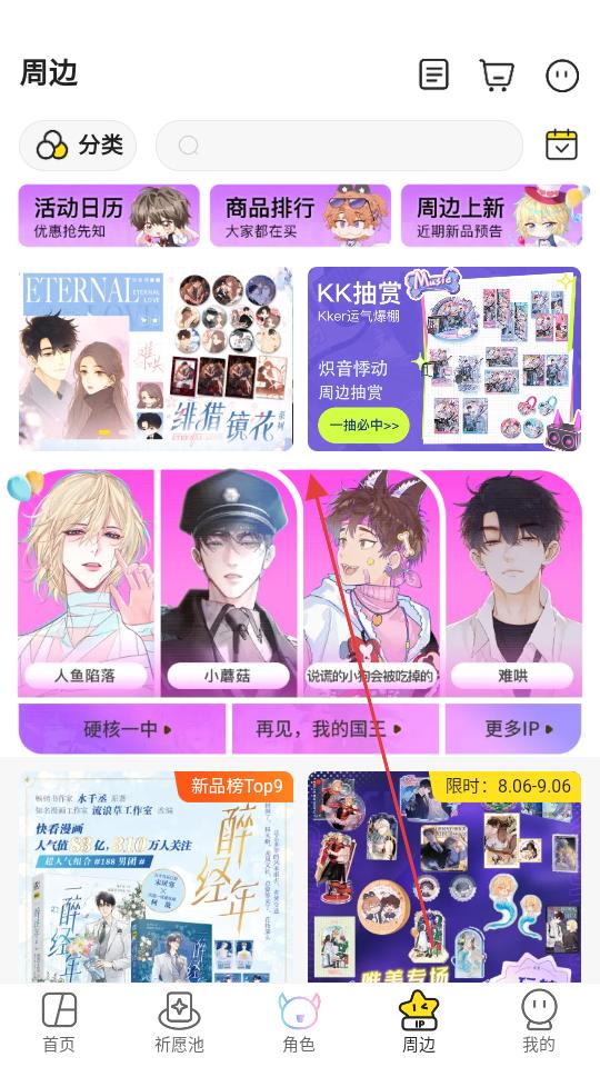 3、切換至熱門IP分類頁面,瀏覽國漫原耽等IP下的周邊商品,挑選心儀周邊,繼續(xù)購物流程。