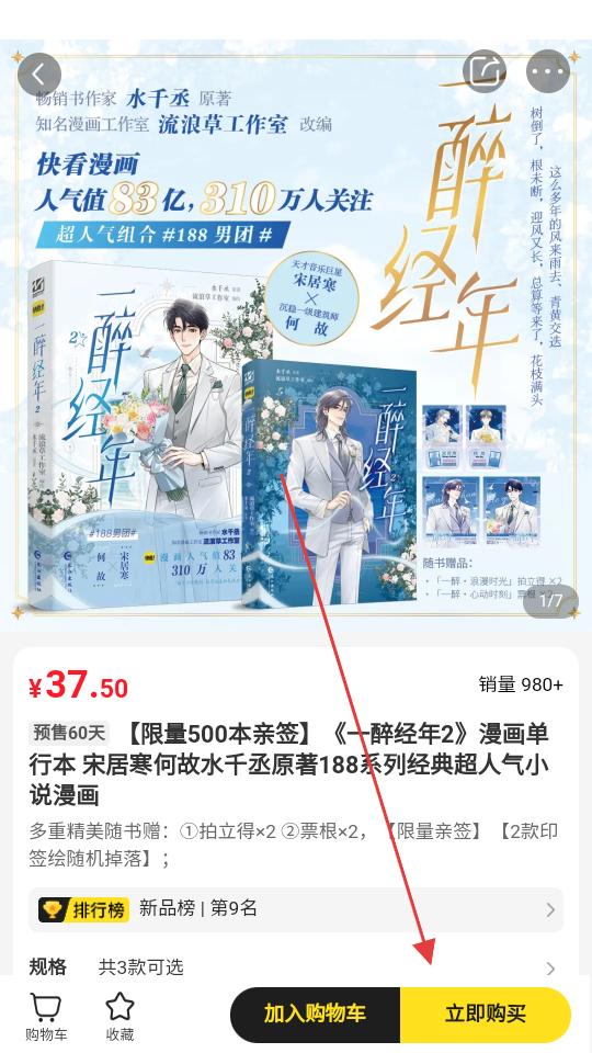 2、進入商品詳情頁,查看價格、銷量、隨書贈品等信息,選擇規(guī)格后,點擊立即購買或加入購物車。