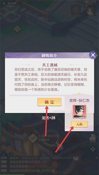 4、完成戰(zhàn)斗后會出現(xiàn)劇情簡介,點(diǎn)擊確定可推進(jìn)劇情,同時(shí)可讓靈師狄仁杰入隊(duì),增強(qiáng)隊(duì)伍實(shí)力。