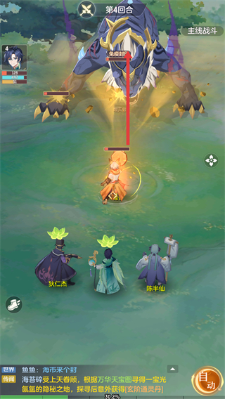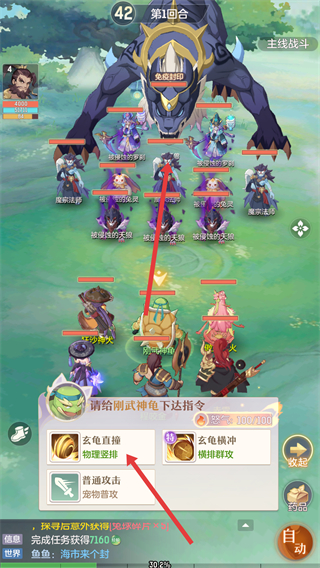 1、主線戰(zhàn)斗時(shí),給嗣神龜下達(dá)指令,選擇玄龜直撞等技能,可發(fā)動攻擊,推進(jìn)戰(zhàn)斗進(jìn)程。
